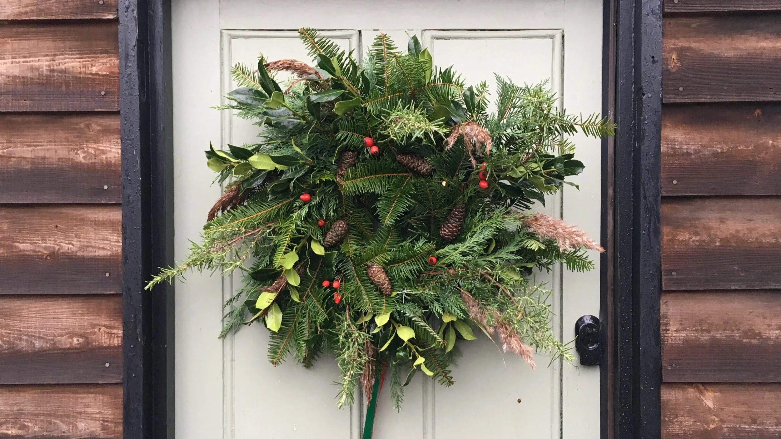 How to make your own Christmas door wreath using the mossing method and evergreen branches.